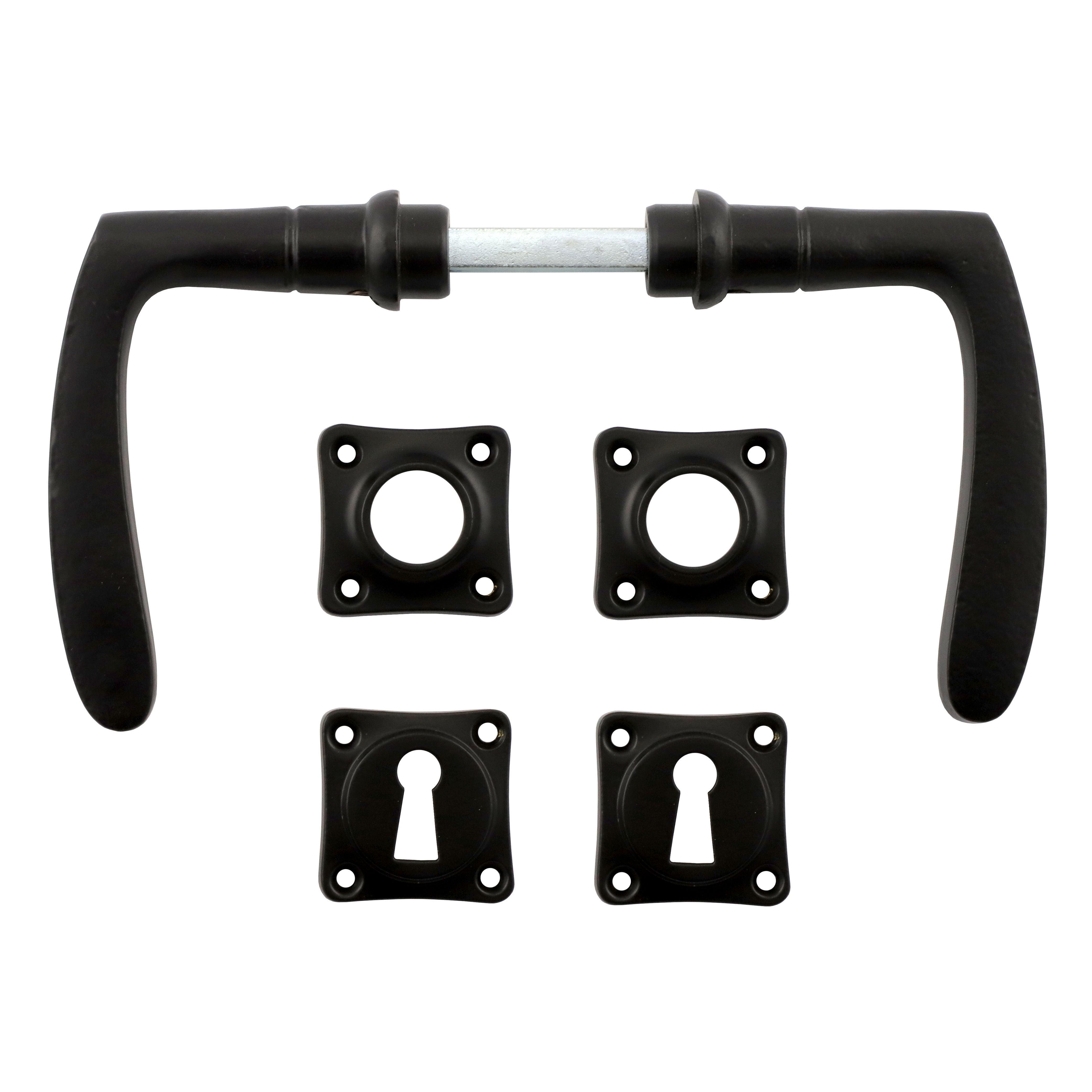 Pulverbeschichteter Türbeschlag aus Eisen für Zimmertüren, mit massiven Griffen und Buntbart-Rosetten. Es handelt sich bei diesem Türgriff um eine authentische Reproduktion nach historischem Vorbild.