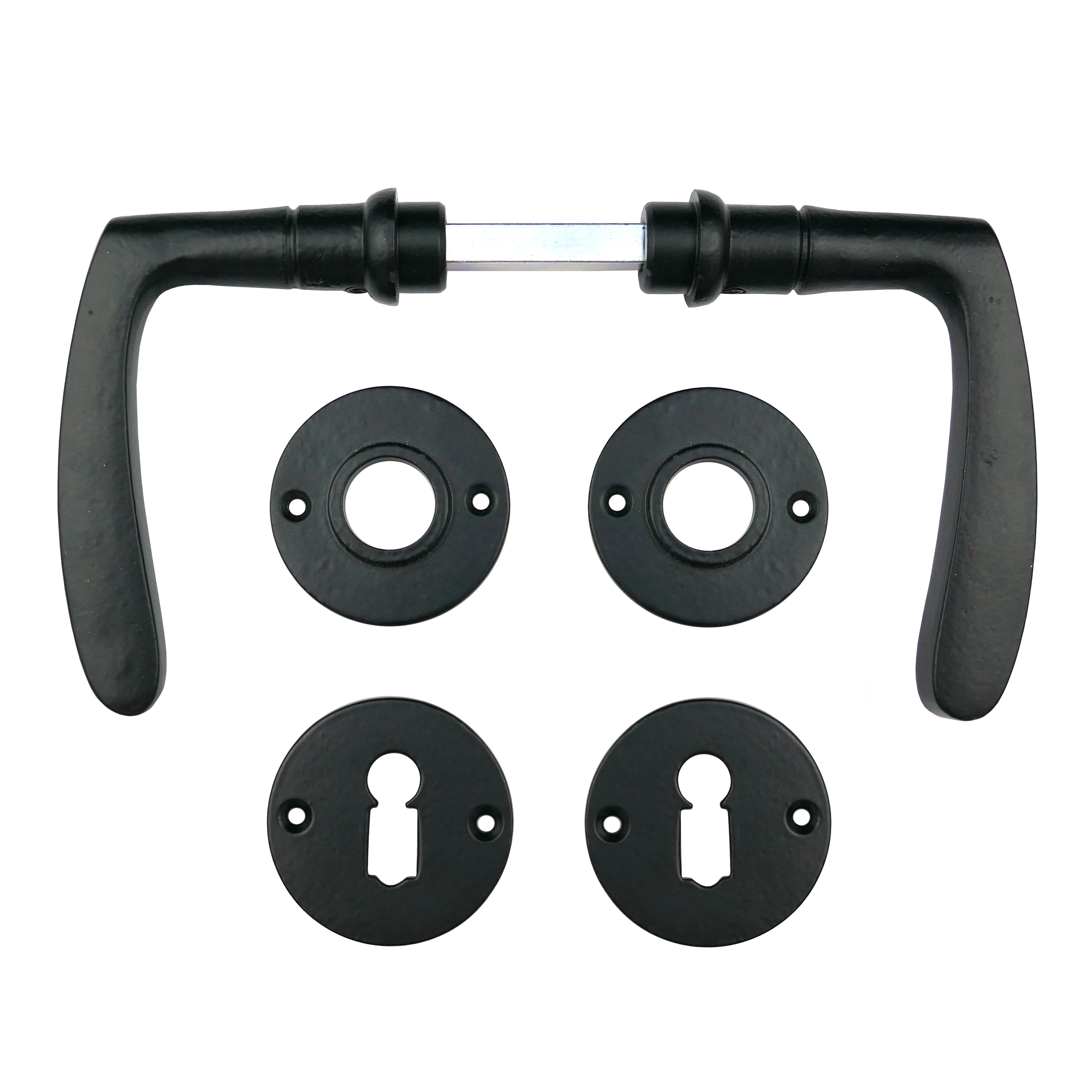 Pulverbeschichteter Türbeschlag aus Eisen für Zimmertüren, mit massiven Griffen und Buntbart-Rosetten. Es handelt sich bei diesem Türgriff um eine authentische Reproduktion nach historischem Vorbild.