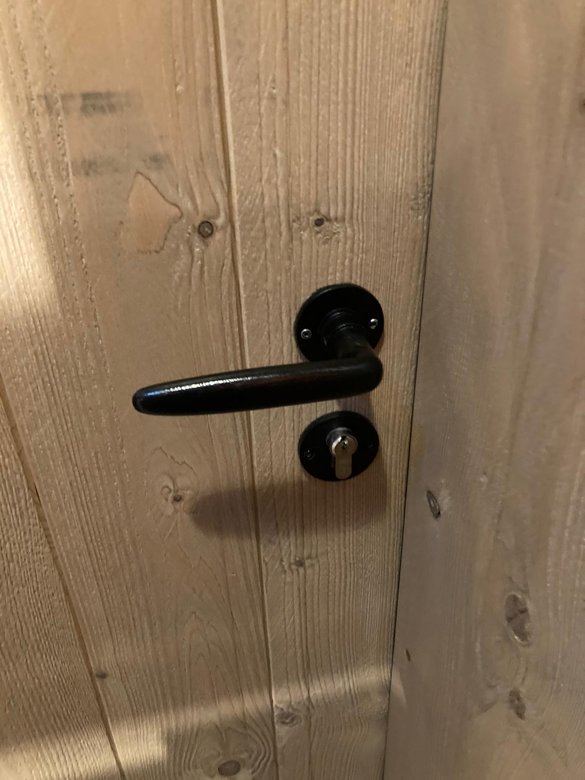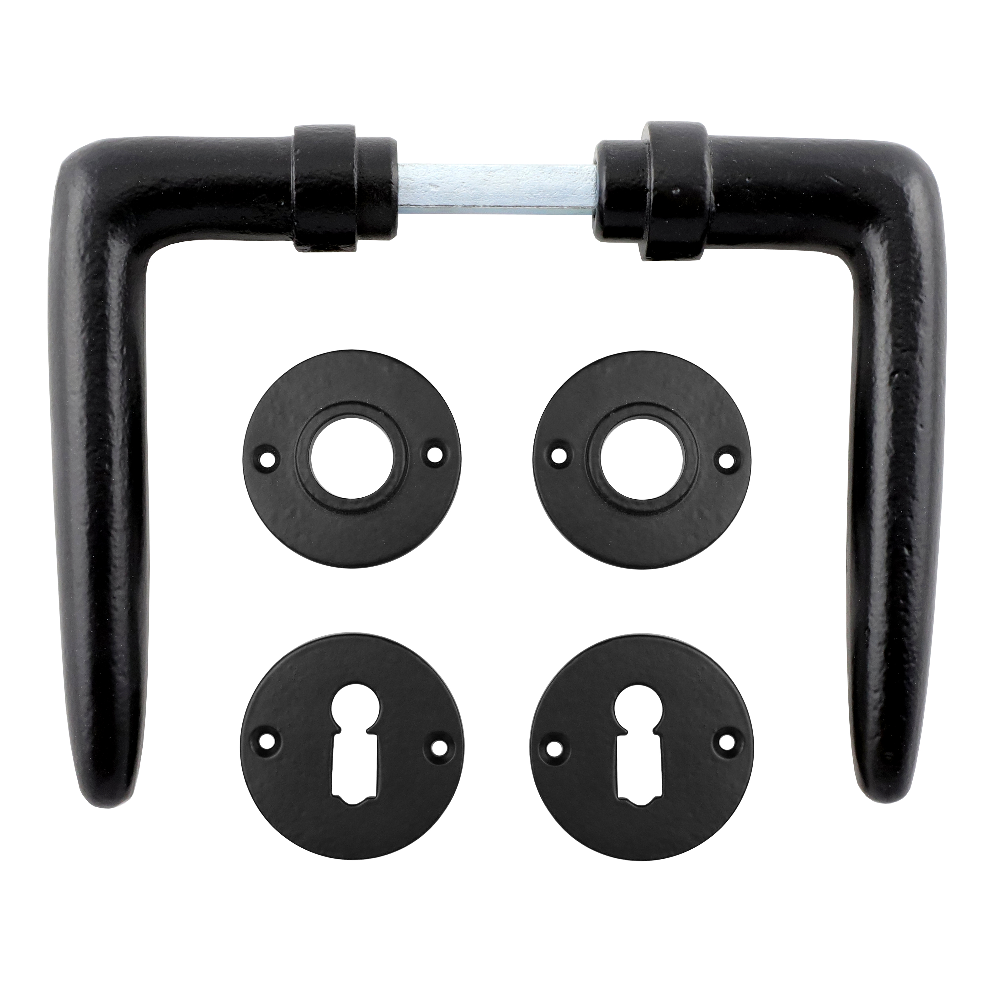 Pulverbeschichteter Türbeschlag aus Eisen für Zimmertüren, mit massiven Griffen und Buntbart-Rosetten. Es handelt sich bei diesem Türgriff um eine authentische Reproduktion nach historischem Vorbild.