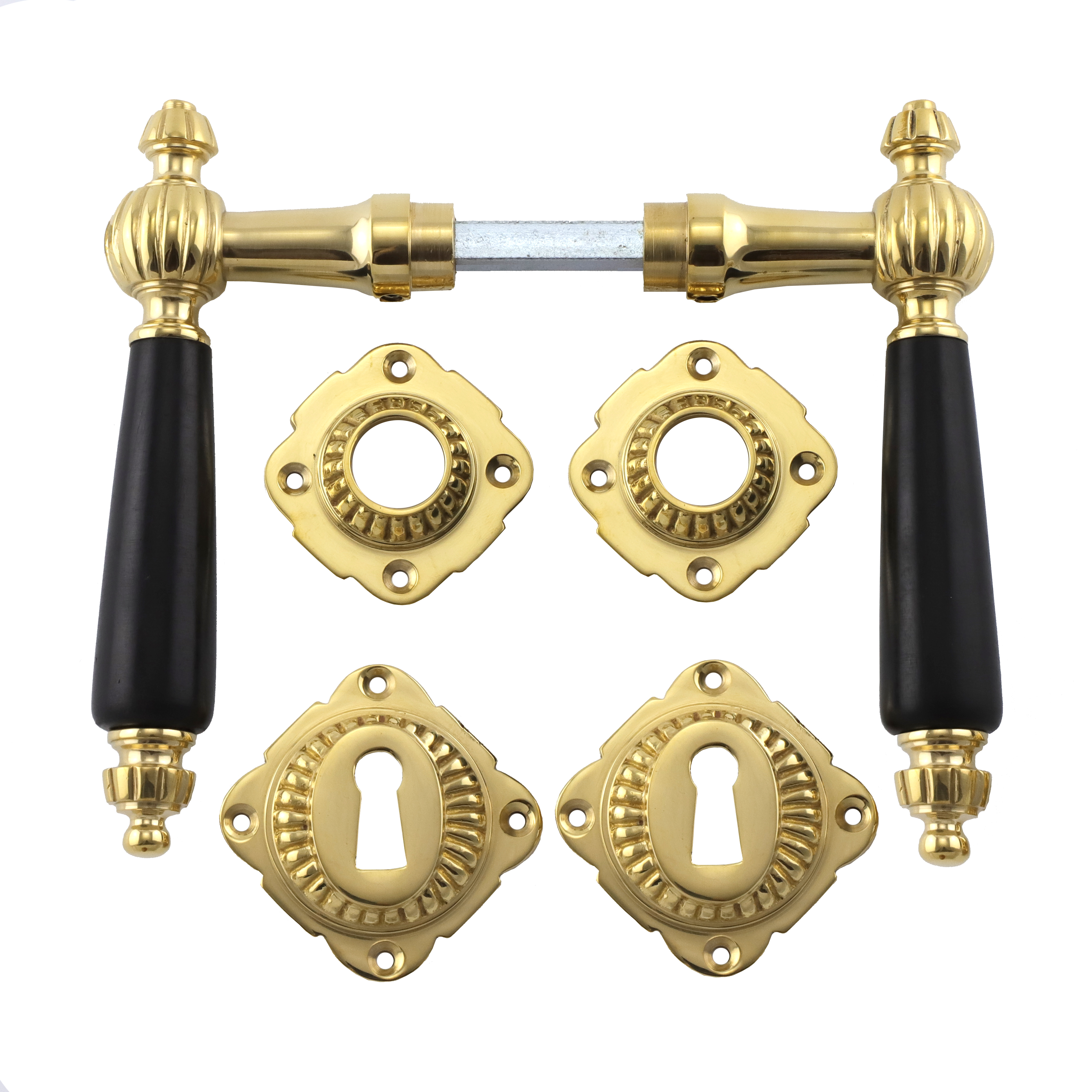 Polierter Türbeschlag aus Messing für Zimmertüren, mit schwarzen Ebenholzgriffen und Buntbart-Rosetten. Es handelt sich bei diesem eleganten Türgriff um eine authentische Reproduktion nach historischem Vorbild.