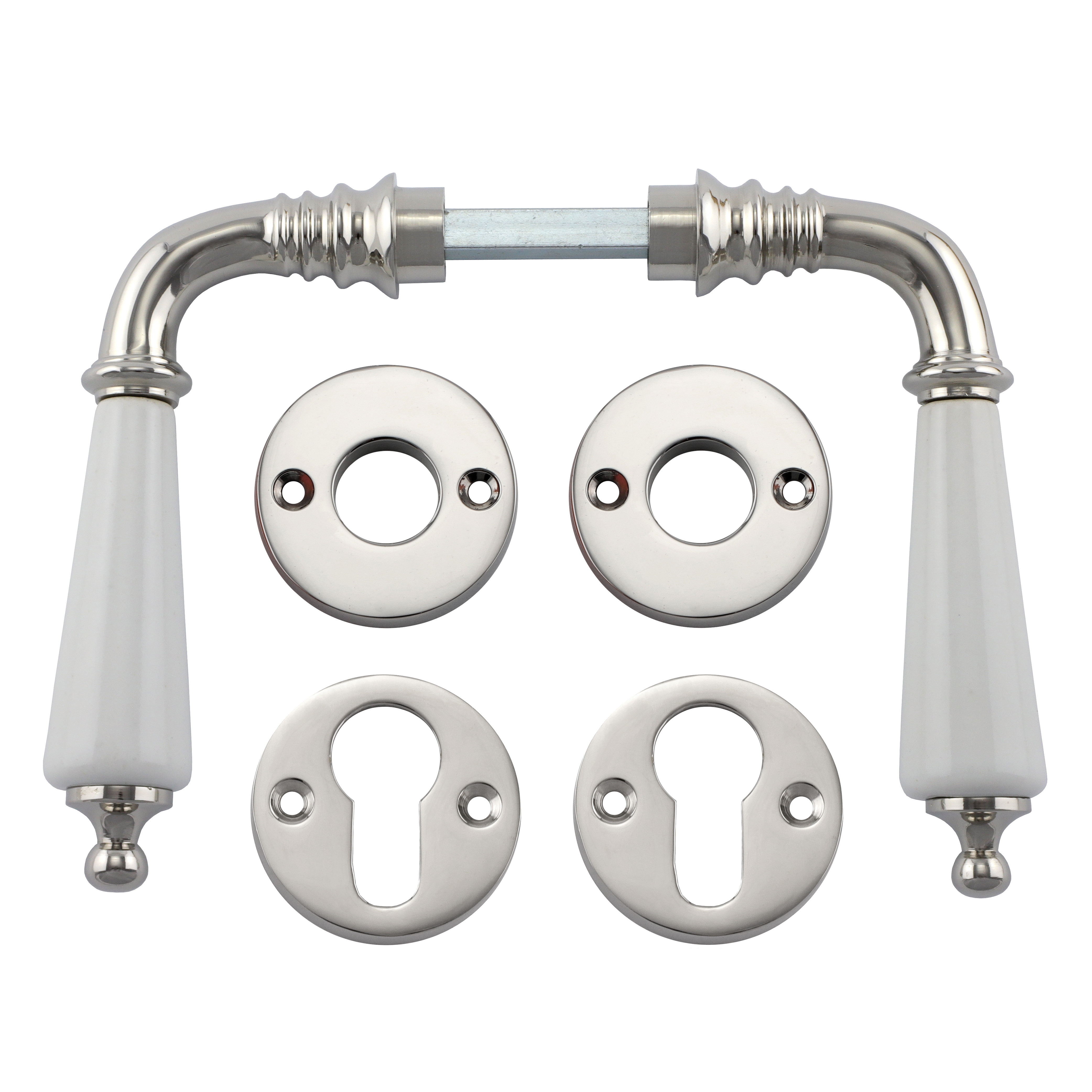 Vernickelter und polierter Türbeschlag aus Messing für Zimmertüren, mit Porzellangriffen und PZ-Rosetten. Es handelt sich bei diesem eleganten Türgriff um eine authentische Reproduktion nach historischem Vorbild.