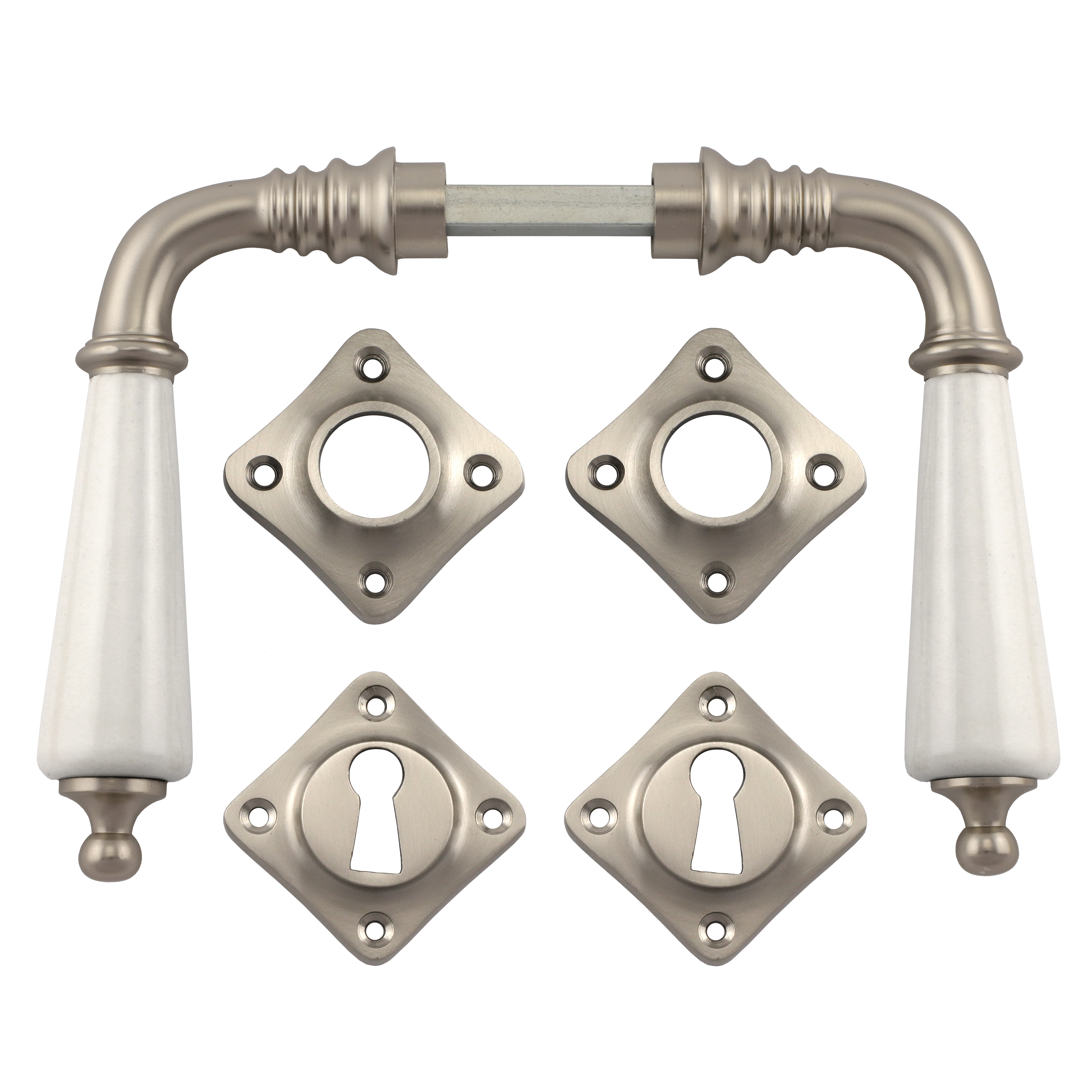 Vernickelter und mattierter Türbeschlag aus Messing für Zimmertüren, mit Porzellangriffen und Buntbart-Rosetten. Es handelt sich bei diesem eleganten Türgriff um eine authentische Reproduktion nach historischem Vorbild.