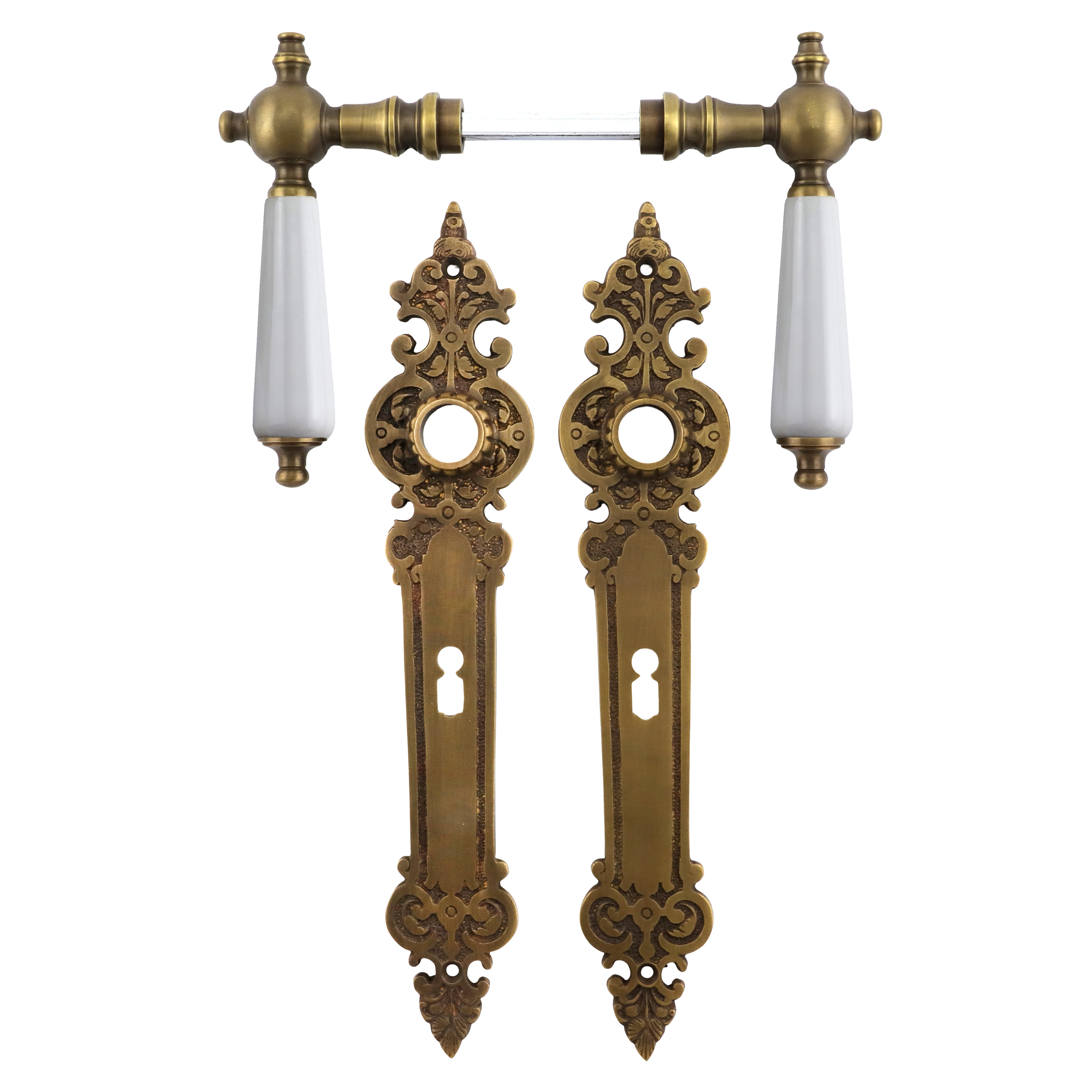 322.0058.45 Türgriffe mit Langschild Gründerzeit Messing patiniert Porzellan
