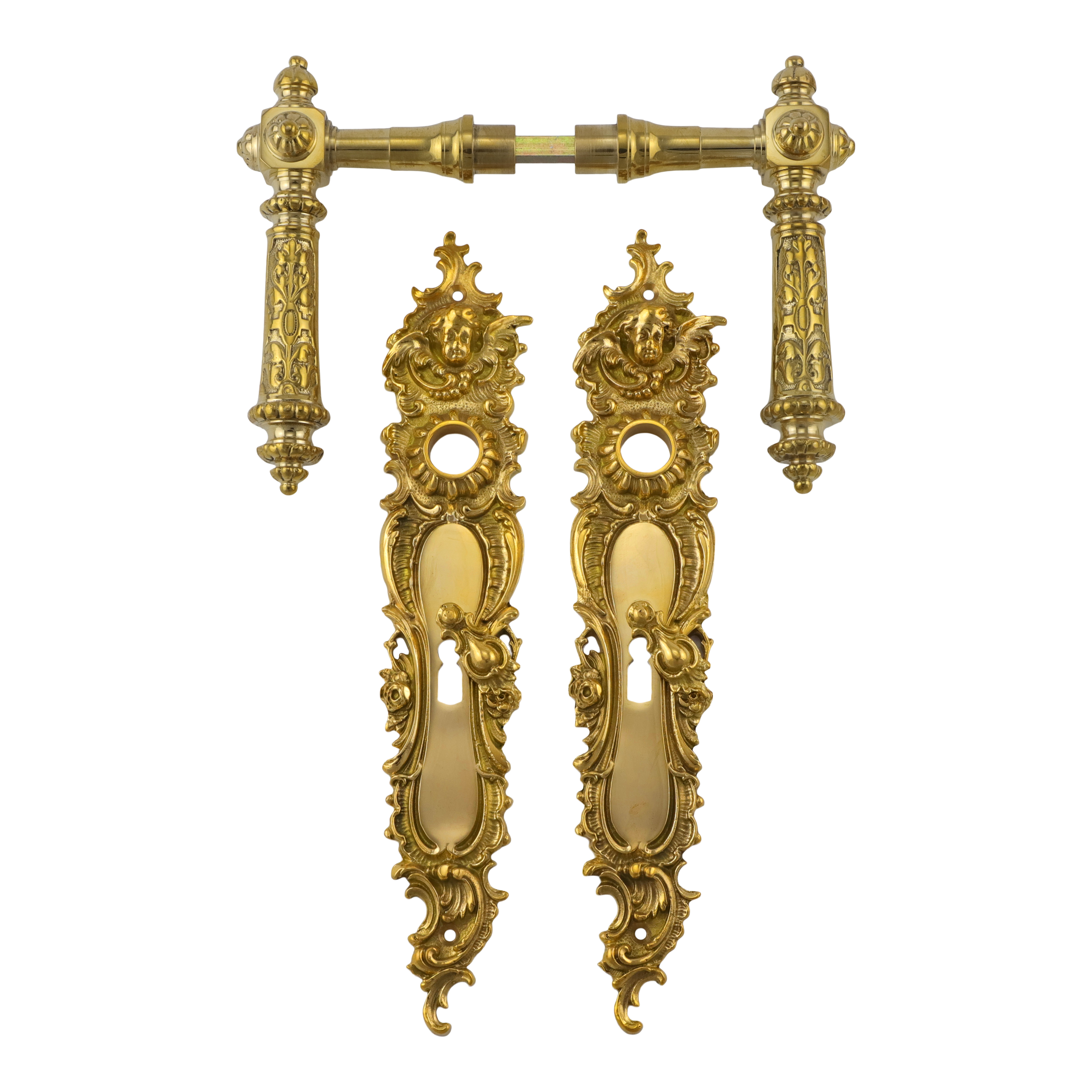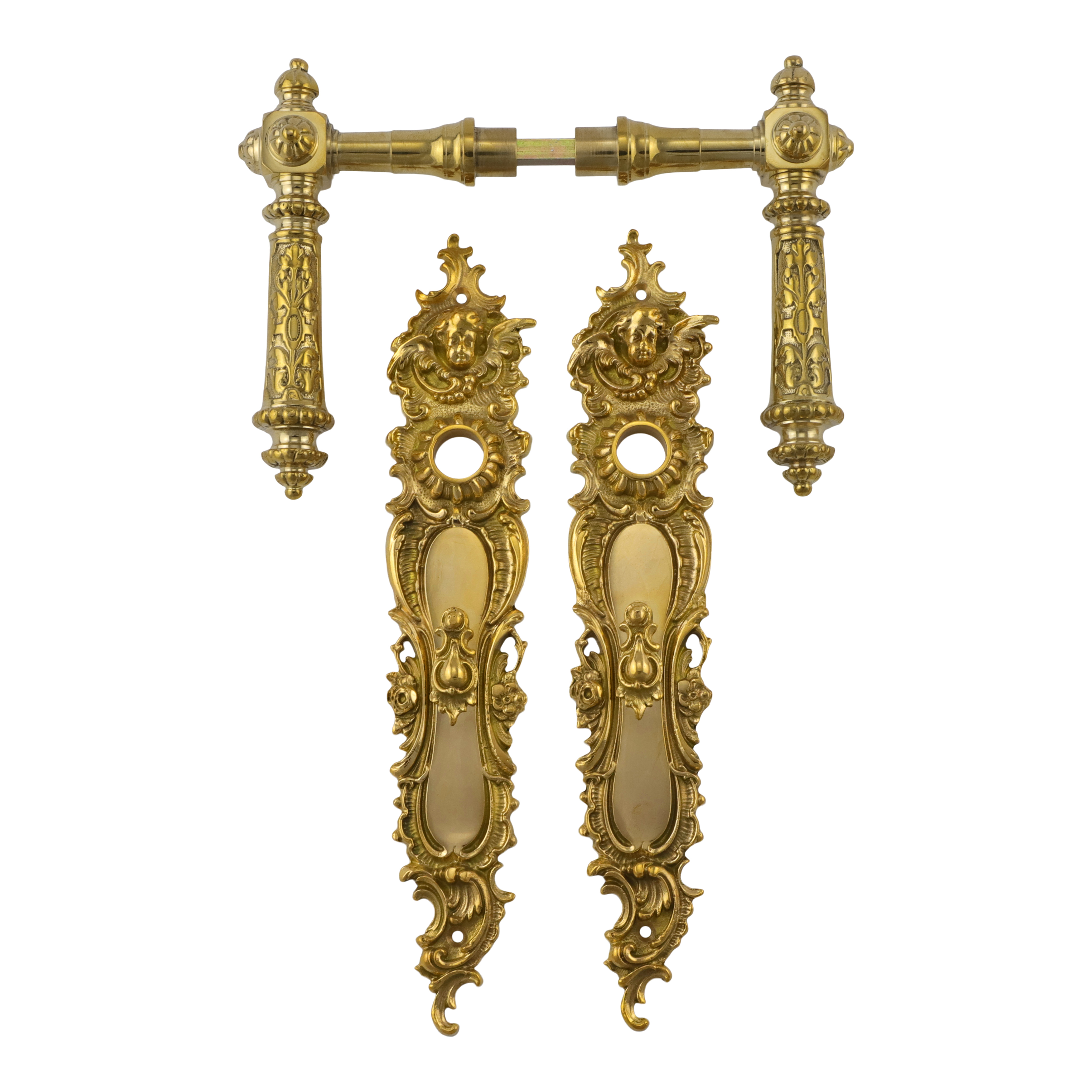 Polierter Türbeschlag aus Messing für Zimmertüren. Es handelt sich bei diesem eleganten Türgriff um eine authentische Reproduktion nach historischem Vorbild.