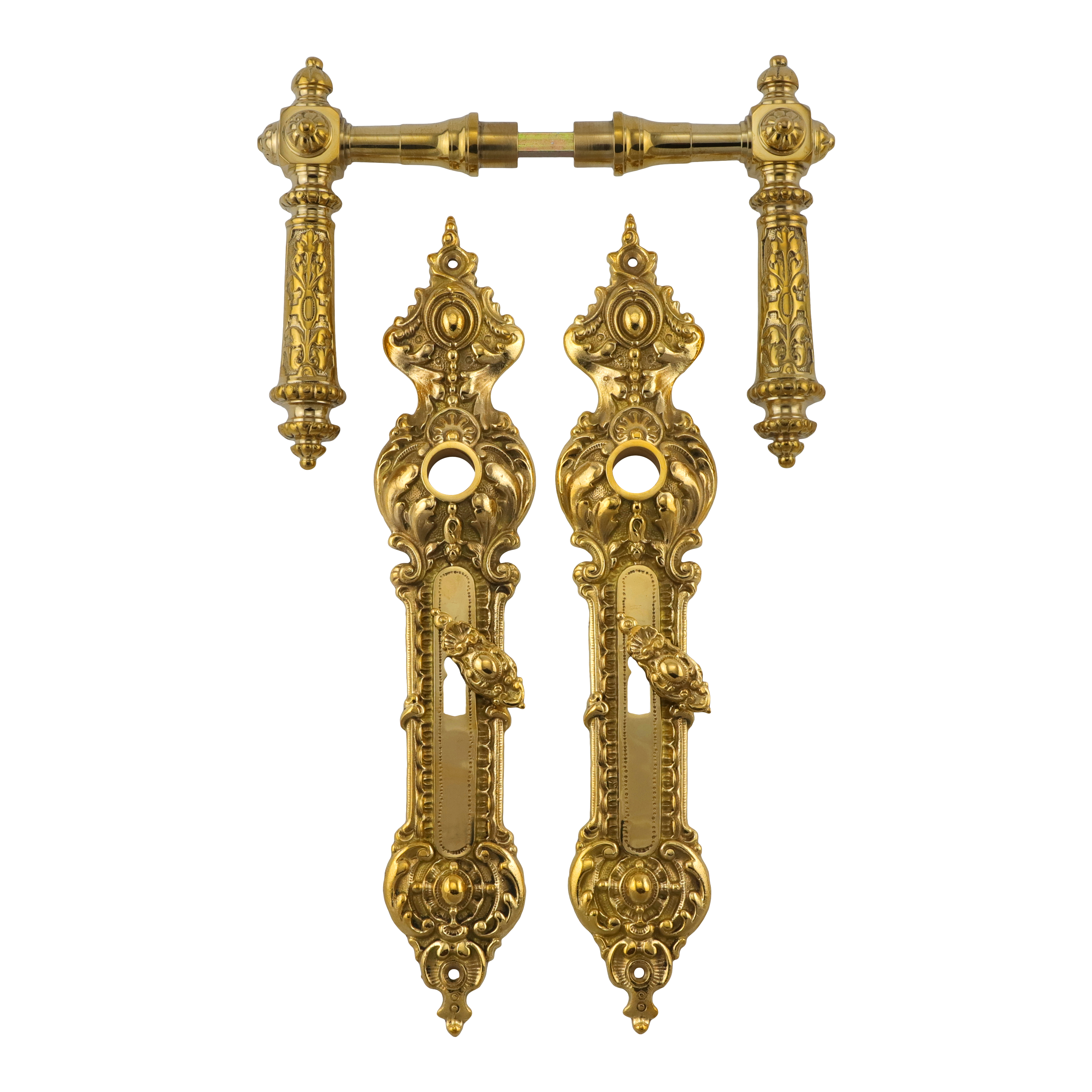 Polierter Türbeschlag aus Messing für Zimmertüren. Es handelt sich bei diesem eleganten Türgriff um eine authentische Reproduktion nach historischem Vorbild.
