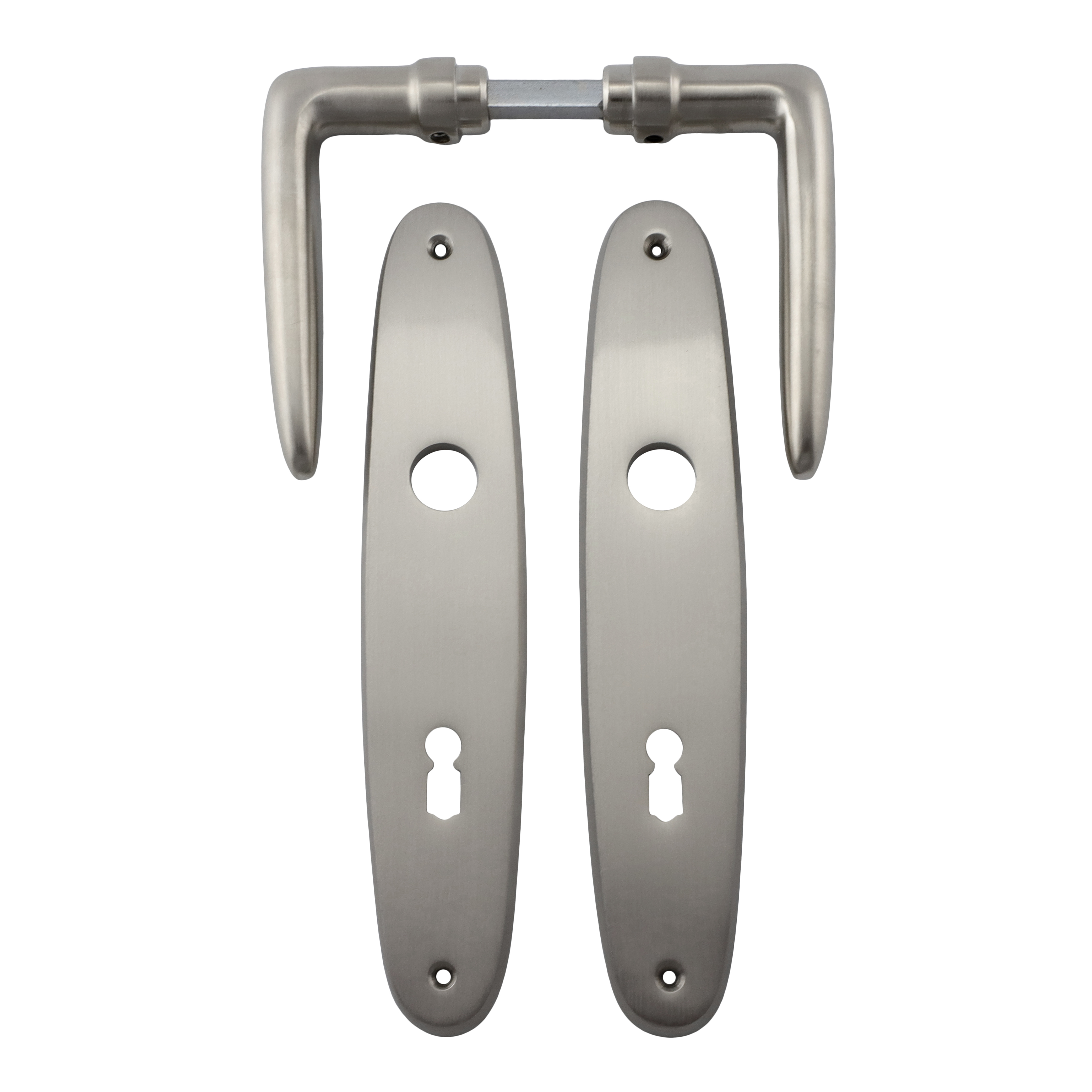 Matt gebürsteter Türbeschlag aus vernickeltem Messing für Zimmertüren. Es handelt sich bei diesem eleganten Türgriff um eine authentische Reproduktion nach historischem Vorbild.