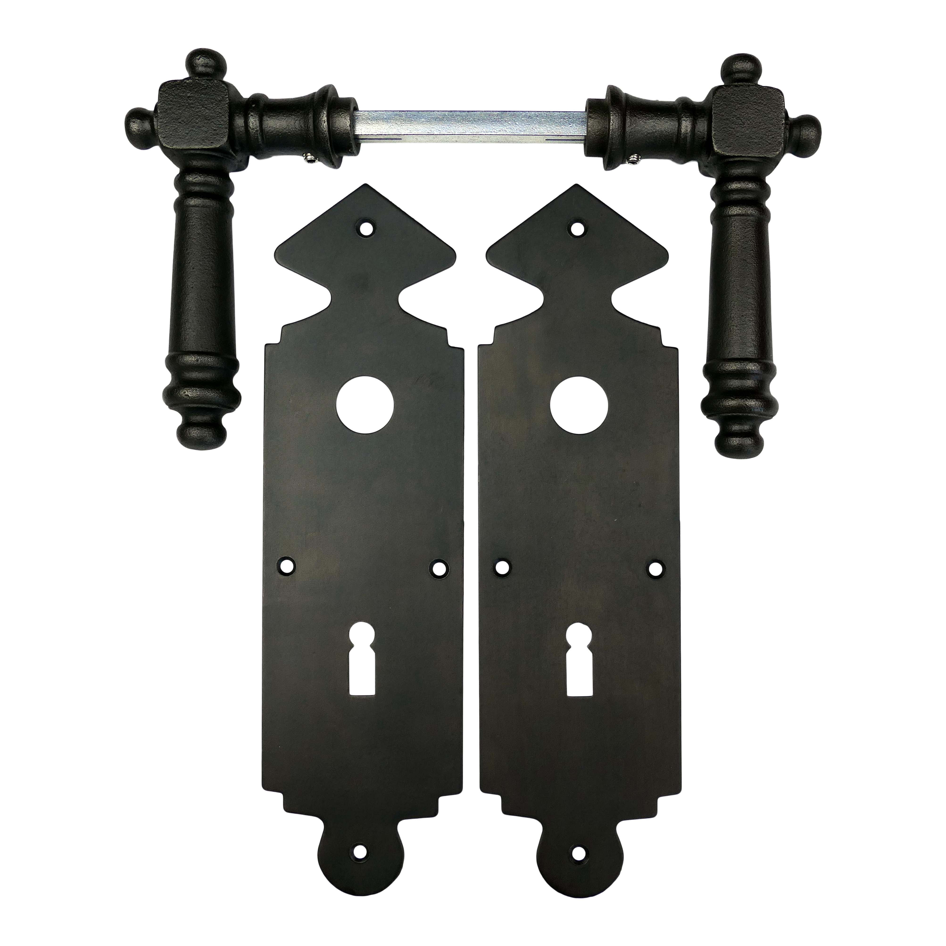 Geschwärzter Türbeschlag aus Eisen für Zimmertüren. Es handelt sich bei diesem außergewöhnlichen Türgriff um eine authentische Reproduktion nach historischem Vorbild.