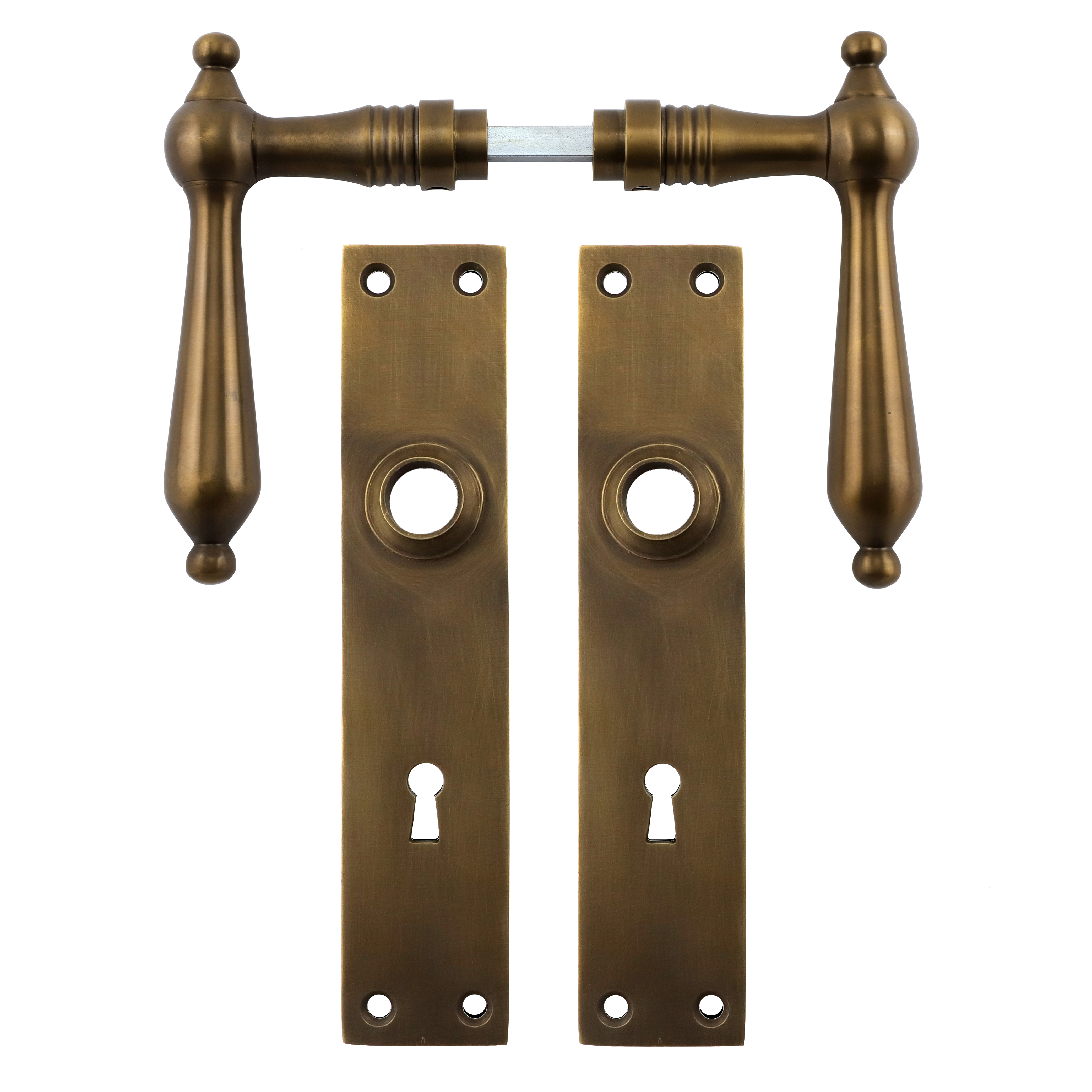 Patinierter Türbeschlag aus Messing für Zimmertüren. Es handelt sich bei diesem Türgriff um eine authentische Reproduktion nach historischem Vorbild.