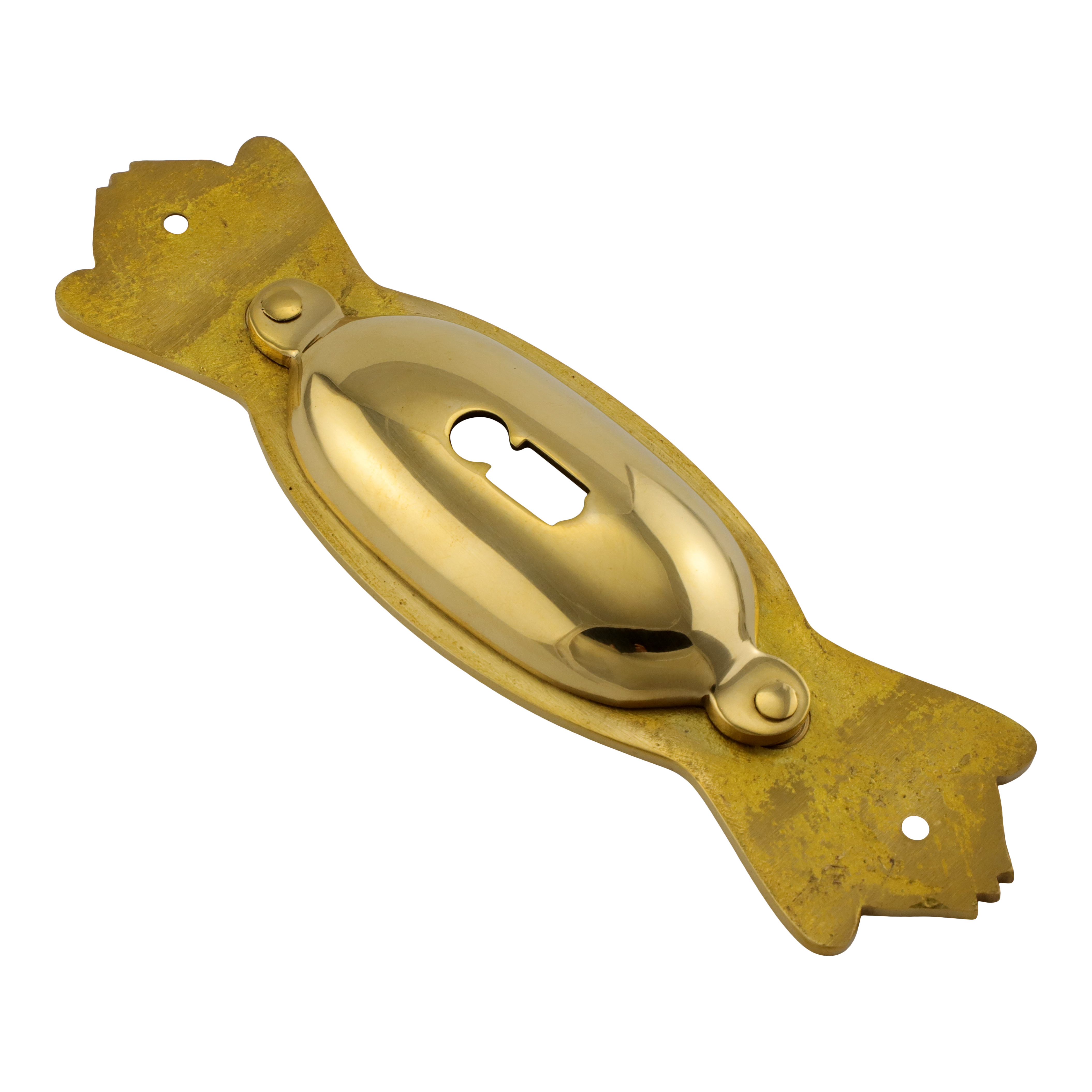 Gefertigt aus poliertem Messing, besticht es durch seine filigranen, floralen Ornamente und die elegante, geschwungene Form. Die vertiefte Mitte ist strukturiert, was einen reizvollen Kontrast zum Hochglanz der Verzierungen bildet. Ideal zur stilvollen Aufwertung historischer Türen oder antiker Möbel.