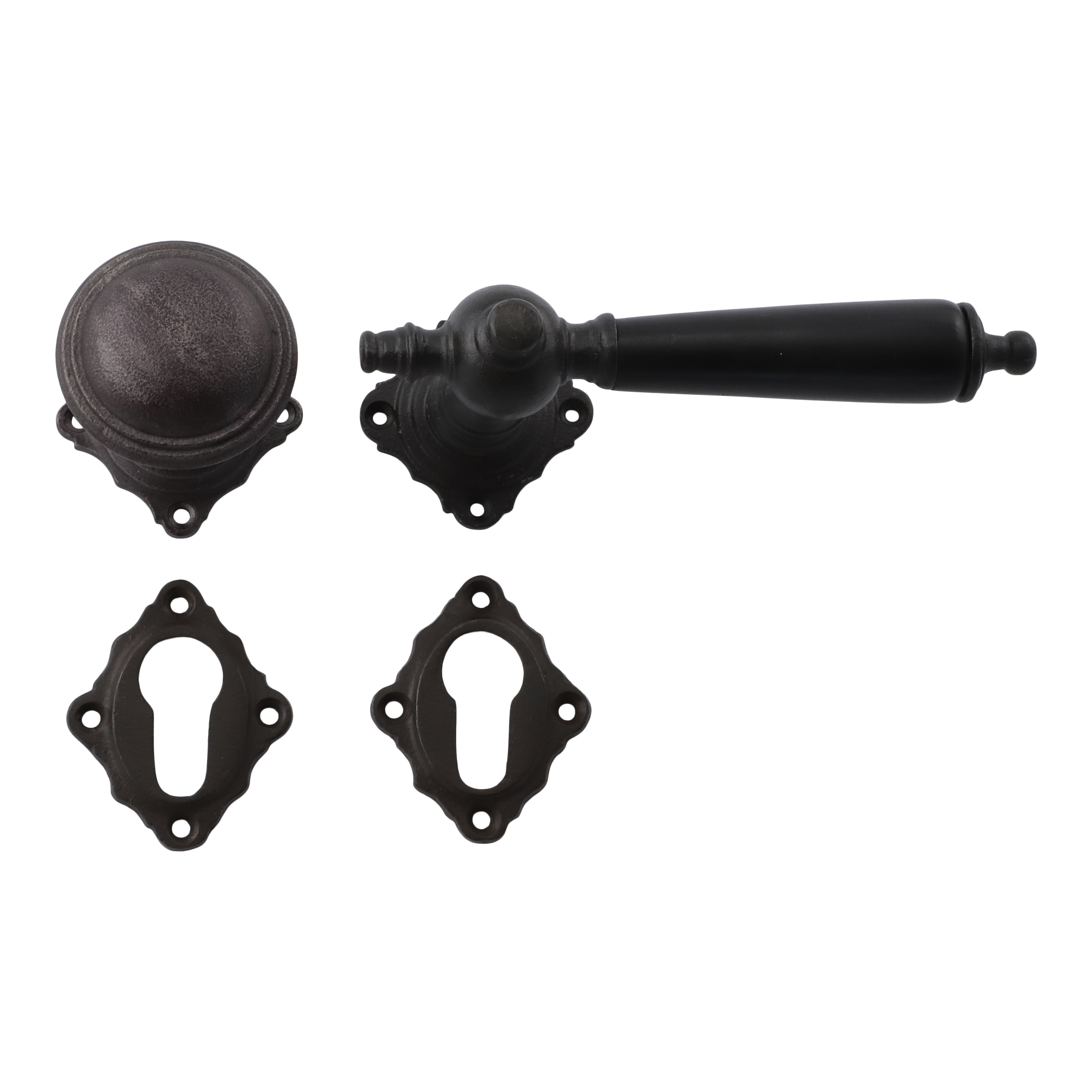 331.0011.60 Eingangstür-Garnitur Türgriffe mit Knauf Historismus-Stil Eisen antik