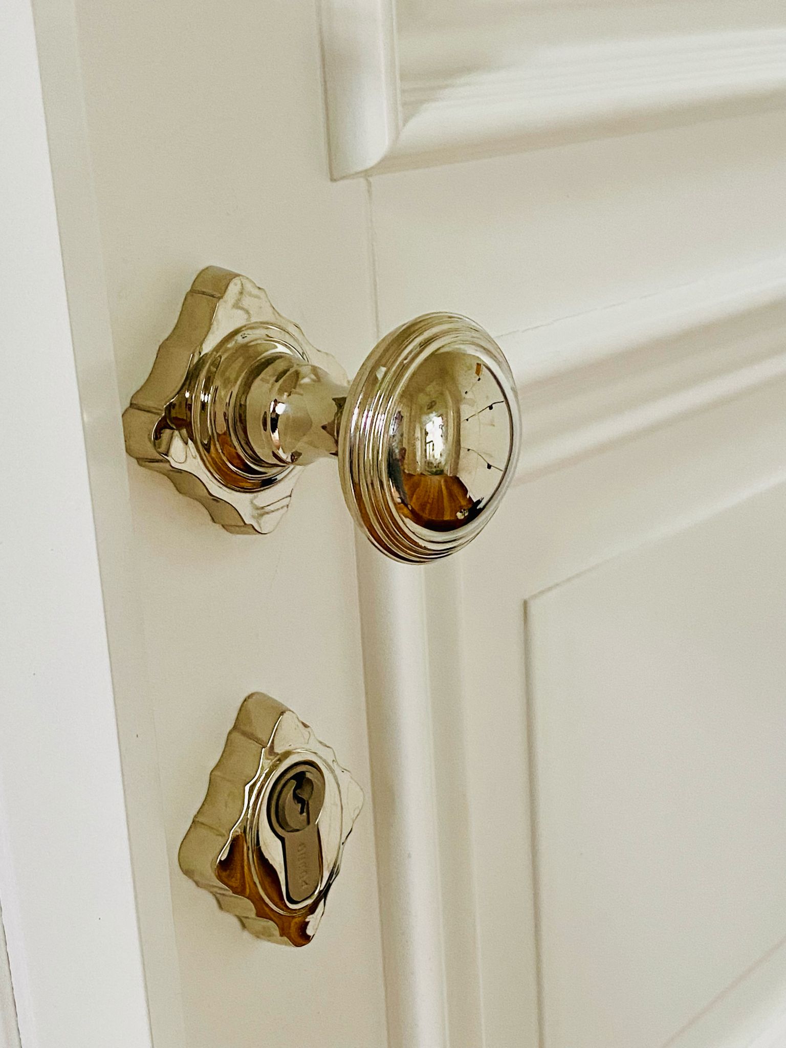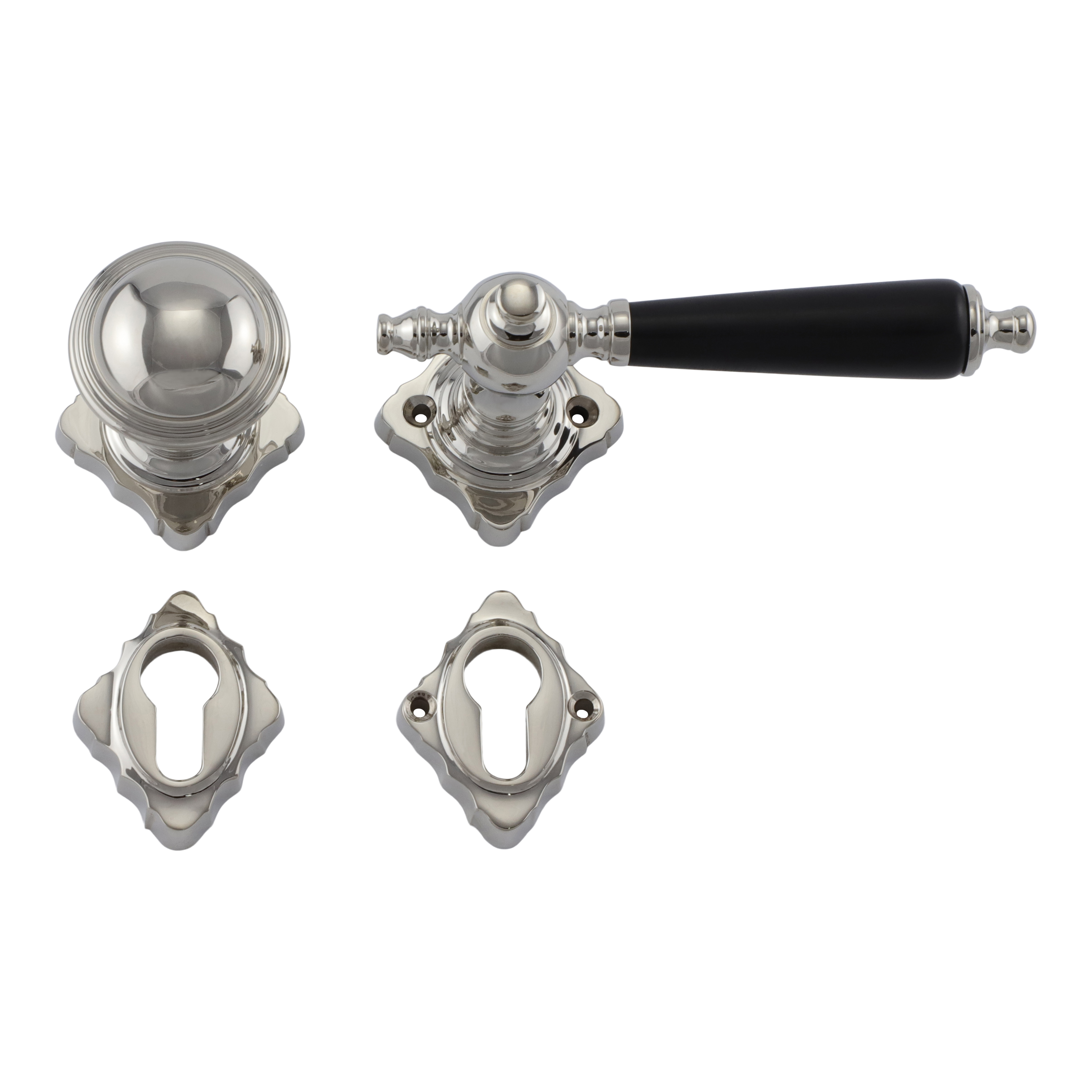 331.0021.10 Haustür-Garnitur Türgriffe mit Knauf Historismus Nickel poliert