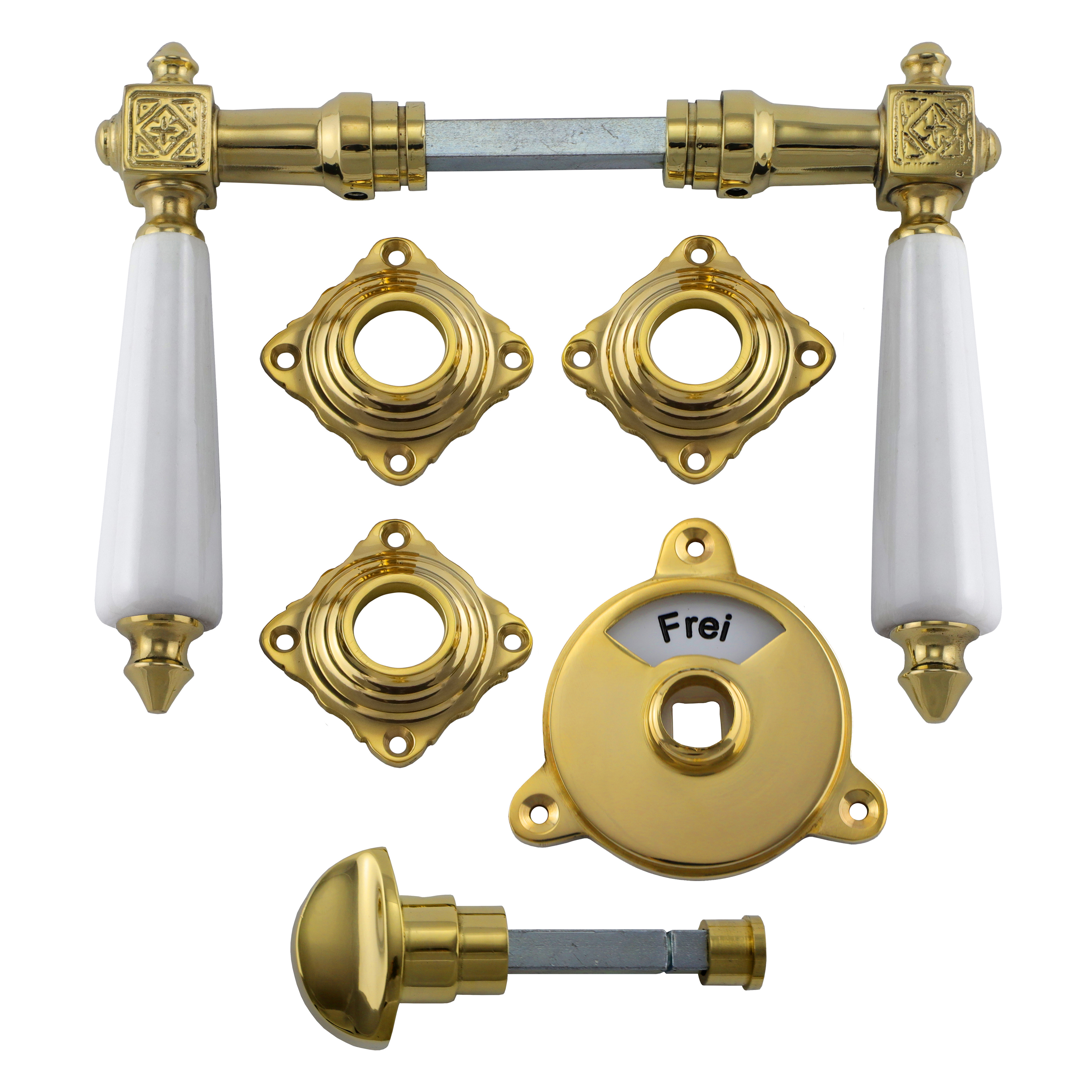 Polierter Türbeschlag aus Messing für Toilettentüren, mit weißen Porzellangriffen und Drehverschluss mit Frei/Besetzt Anzeige. Es handelt sich bei diesem eleganten Türgriff um eine authentische Reproduktion nach historischem Vorbild.