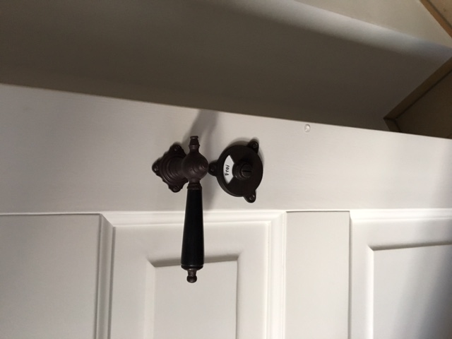 Antikisierter Türbeschlag aus Eisen für Toilettentüren, mit schwarzen Ebenholzgriffen und Drehverschluss mit Frei/Besetzt Anzeige. Es handelt sich bei diesem Türgriff um eine authentische Reproduktion nach historischem Vorbild.
