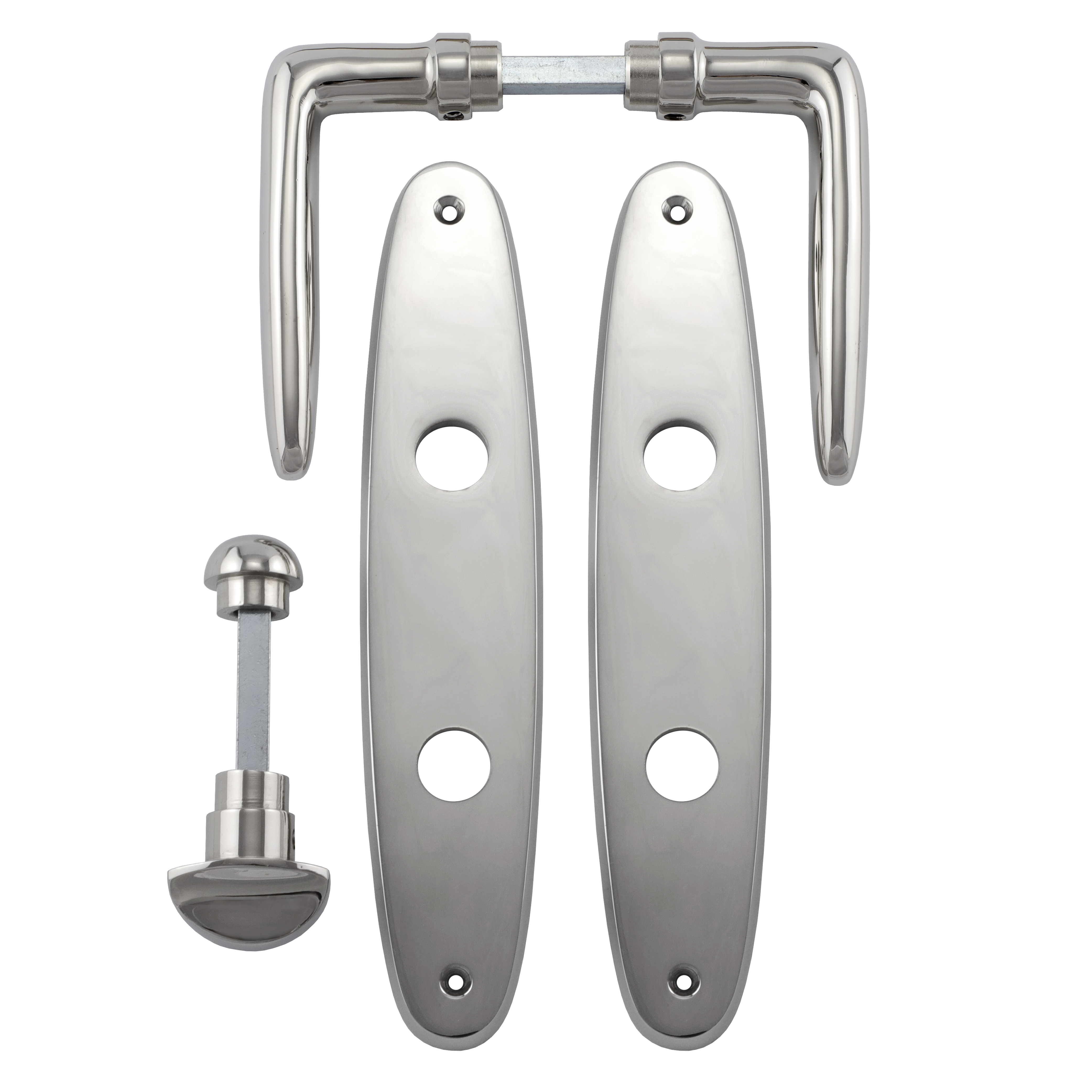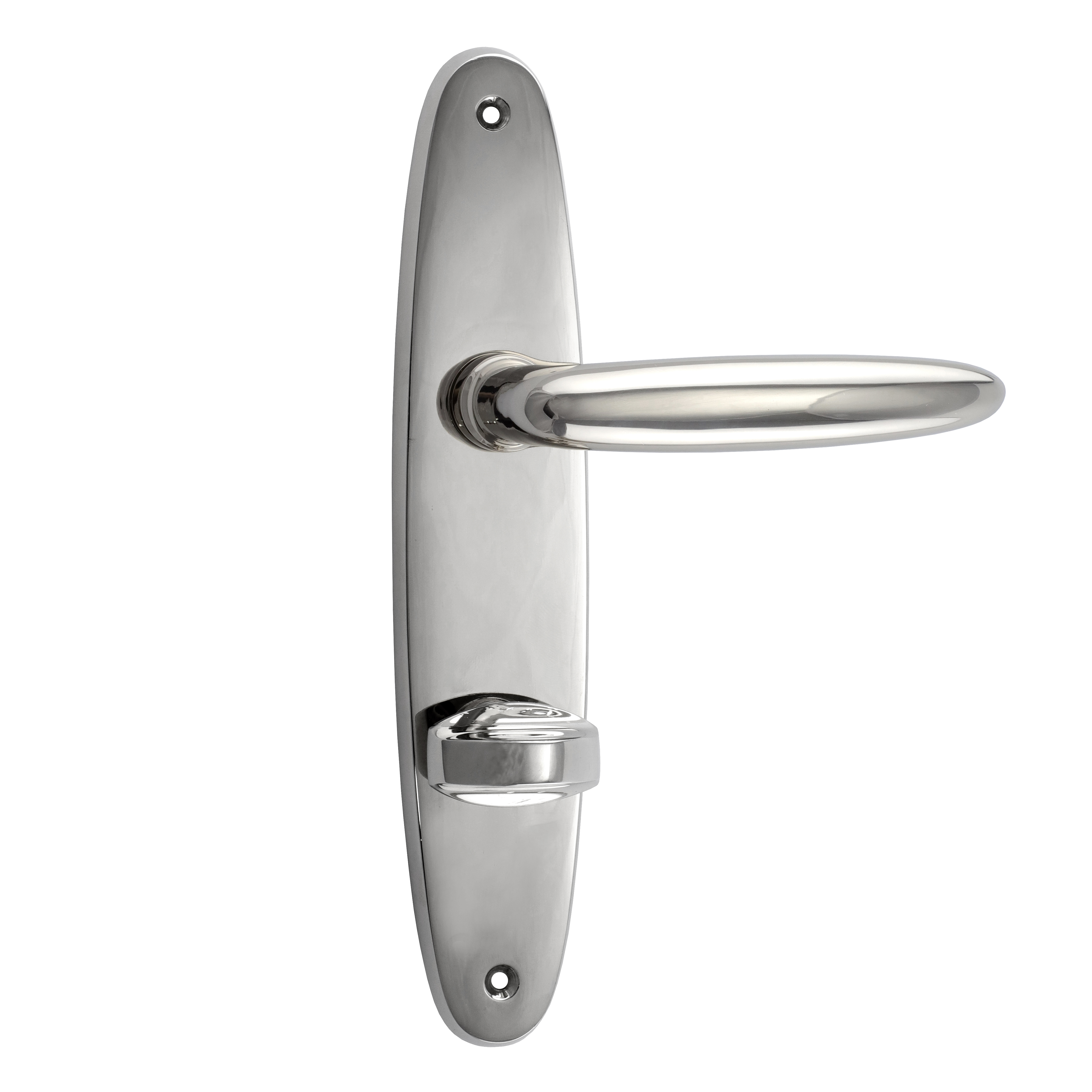 Vernickelter und polierter Türbeschlag aus Messing für Toilettentüren, mit massiven Griffen und Drehverschluss. Es handelt sich bei diesem eleganten Türgriff um eine authentische Reproduktion nach historischem Vorbild.