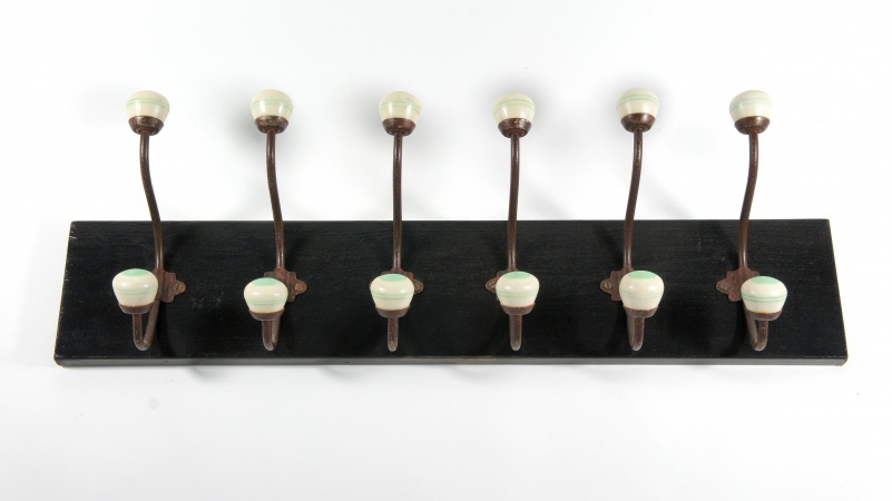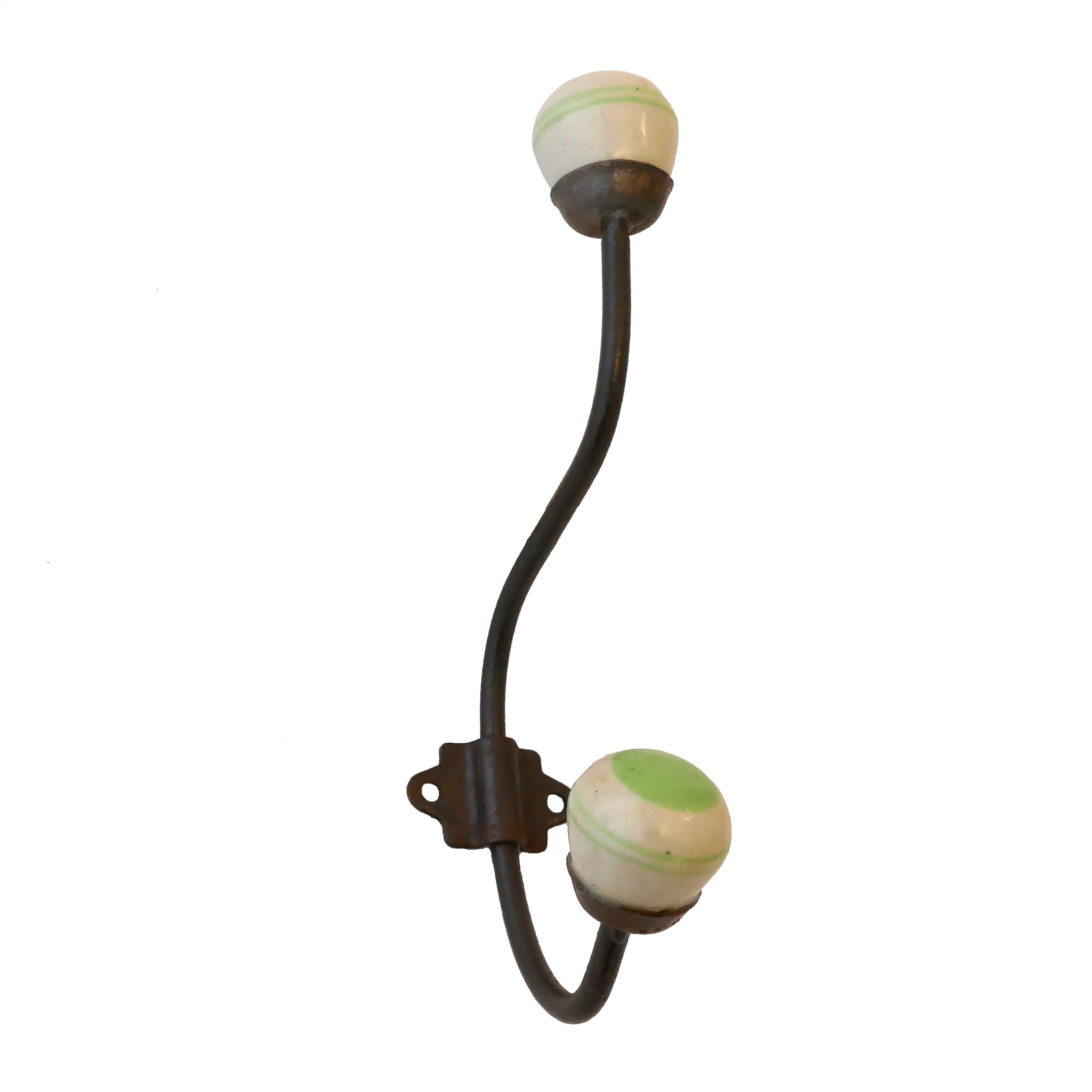 Vertikal doppelt verwendbarer Garderobenhaken mit grün-weißem Porzellankopf in Eisen antik für den Innenbereich.