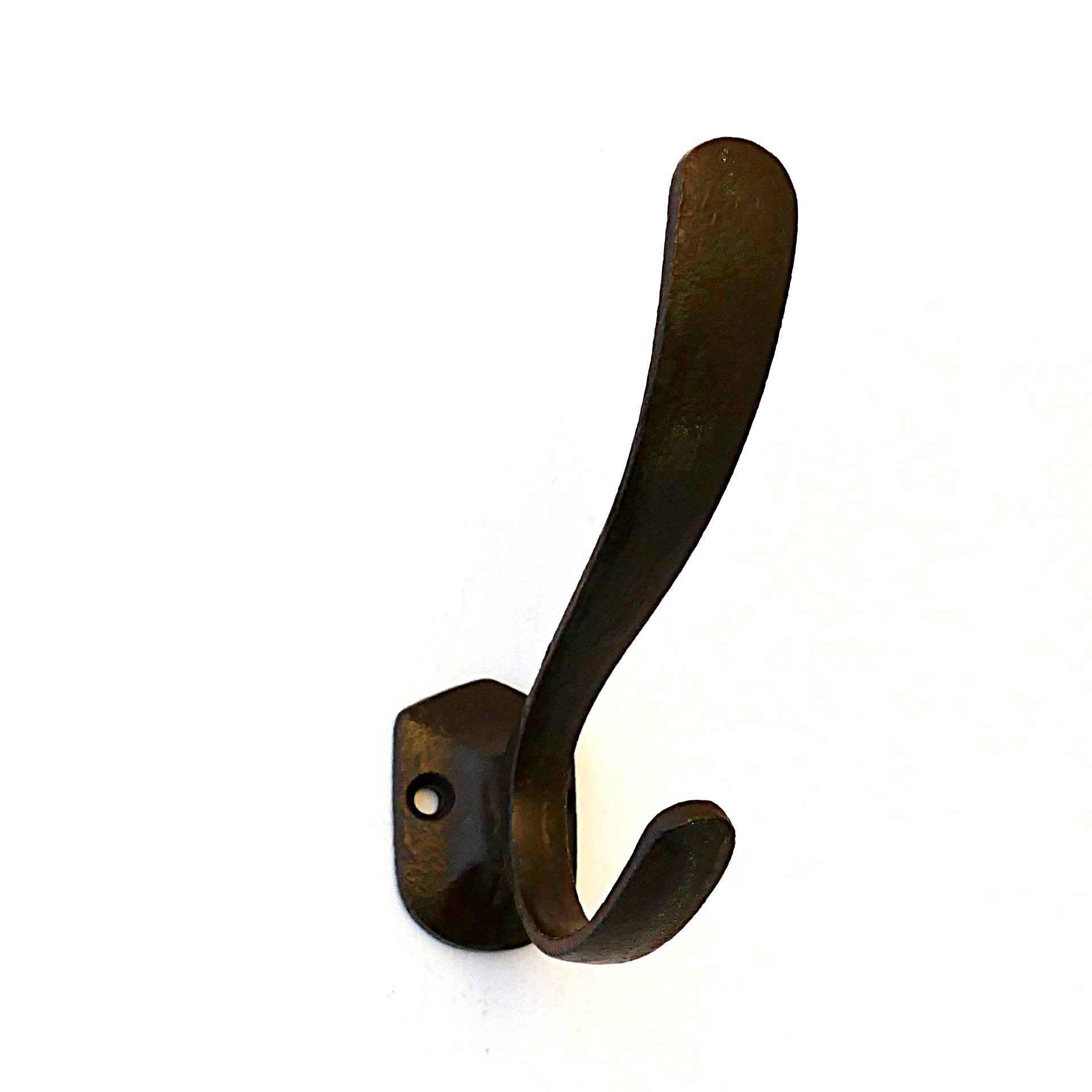 Breit geschwungenes JCB Hakenmodell. Der robuste Kleiderhaken ist in Eisen antik gefertigt und bietet vertikal übereinander eine doppelte Aufhängemöglichkeit für z. B. einen Schal und eine Jacke. Mehrere dieser Eisenhaken sind sehr schön nebeneinander aufhängbar.