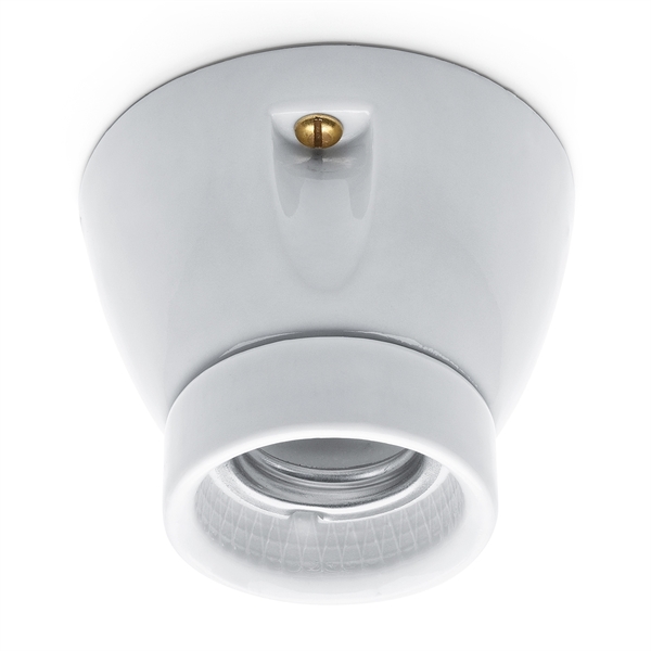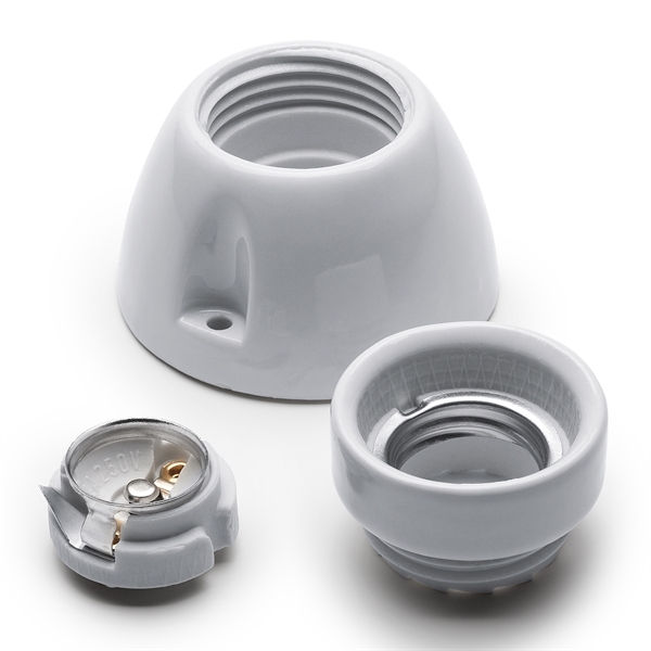 Schlichte Lampenfassung aus Porzellan. Dreiteilig. Innenfassung aus Metall, E 27 (max. 75 W), IP 20. Höhe 6 cm, max. 7,5 cm Ø, Gewicht 200 g. Lieferung ohne Leuchtmittel.