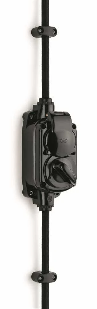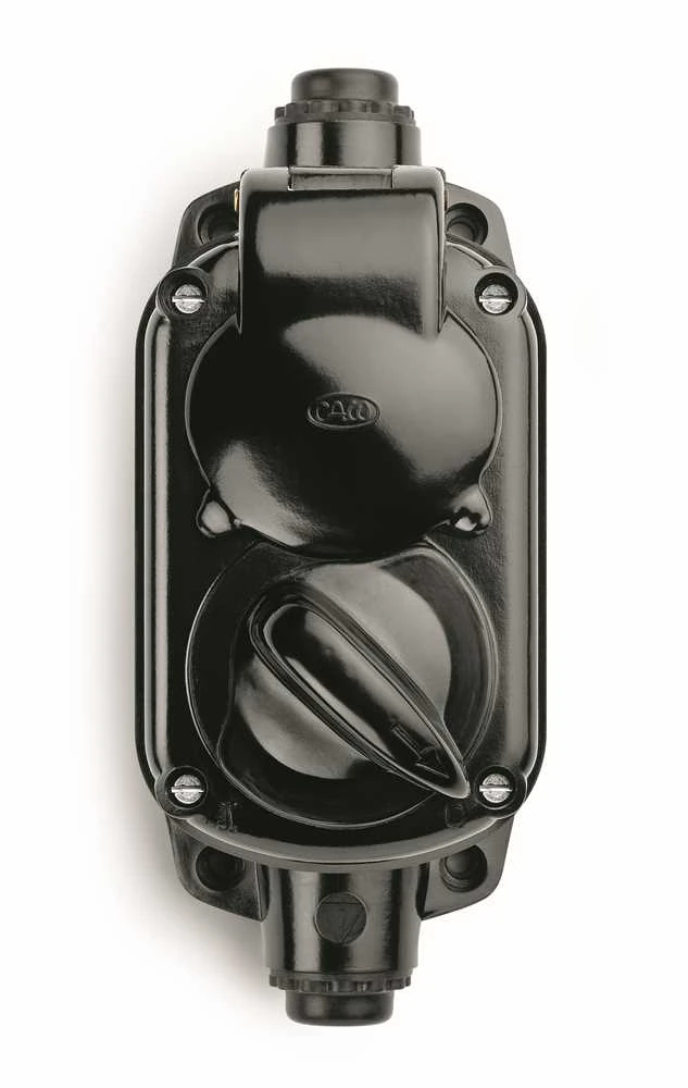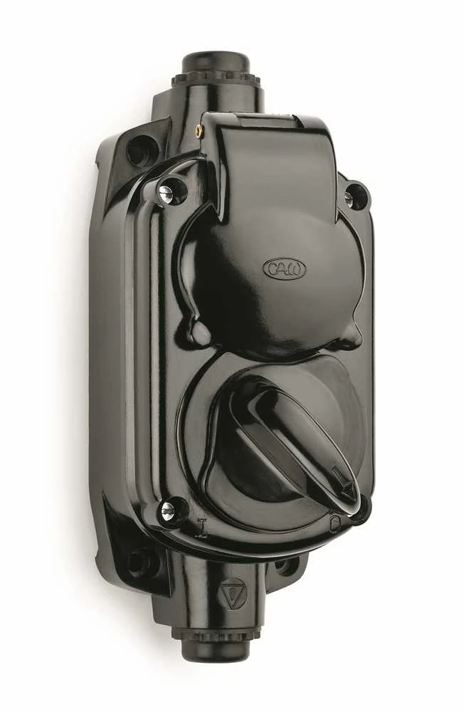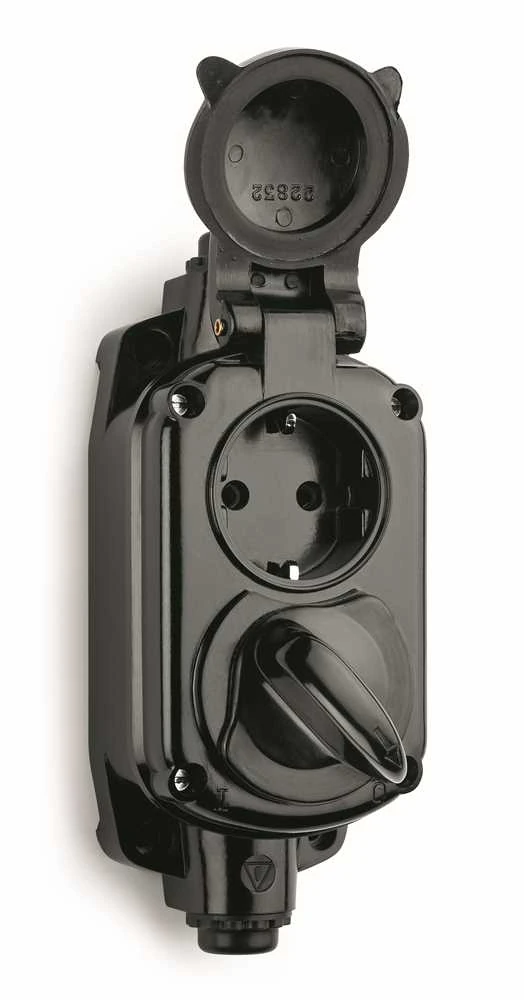 Abschaltbare Steckdose über Drehschalter-Verriegelung. Die Stromabnahme ist nur bei verriegelter Steckdose (Drehschalter in Stellung I) möglich, der Stecker ist nur in Stellung 0 herausziehbar. Diese Steckdose wurde ursprünglich für den Einsatz in Räumen wie Garage, Keller und auf Baustellen entwickelt, um bei einem Herausziehen des Steckers einen eventuellen Funkenflug und damit Explosionsgefahr zu verhindern. Die Befestigung des Gehäuses auf Putz erfolgt mittels vier seitlicher Verschraubungen. Kabelzuführung auf Putz.